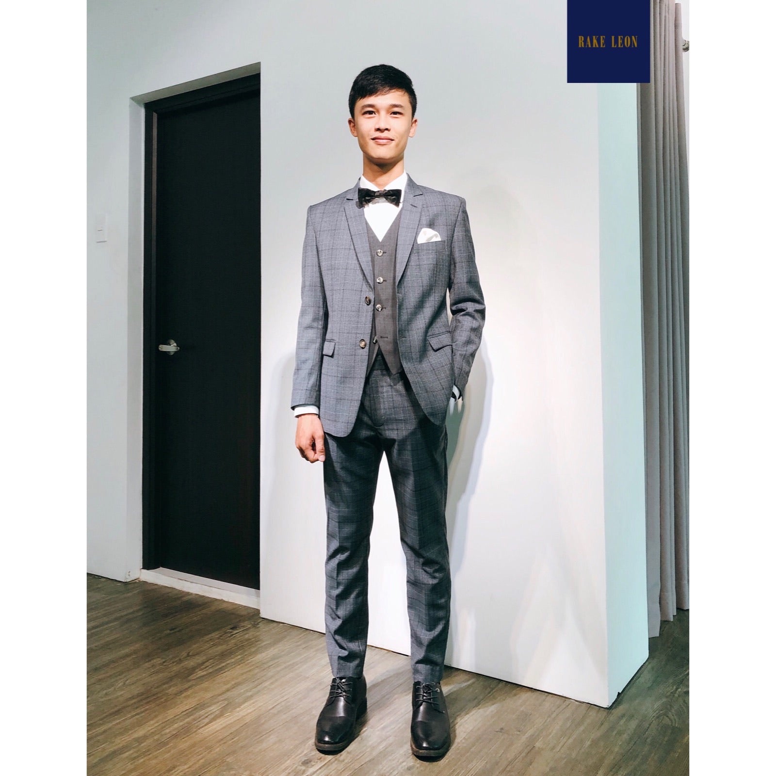 Khuôn mặt thanh tú, vóc dáng mảnh khảnh, phong thái nhẹ nhàng nhưng cởi mở lắng nghe là những cảm nhận mà Leon có được khi tiếp xúc với Minh, đang hoạt động kinh doanh lĩnh vực phần mềm. Qua tư vấn của Leon và góp ý của người anh rể tận tình Hoàng Anh (cũng là khách Leon Suits), Minh chọn bộ suit 3 mảnh dòng Rake Leon (10,000,000VND) gồm áo quần vải xám Prince of Wales còn gilet tương phản màu xám tối hoạ tiết nailhead. Bộ suit được cắt clear cut, tối giản đúng proportion giữa ve áo, túi hai bên của suit và cổ áo sơ mi, cộng với phụ kiện nơ rất hợp với tính cách của Minh.